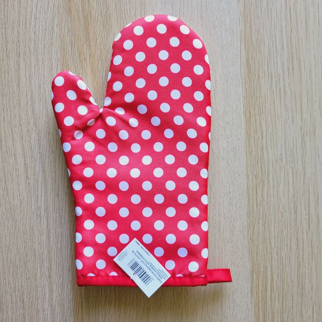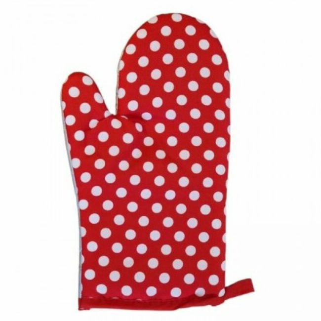 A piros alapon fehér pöttyös edényfogó kesztyű egyszerre idézi a retro konyhák hangulatát és nyújt megbízható védelmet a forró edények kezeléséhez.