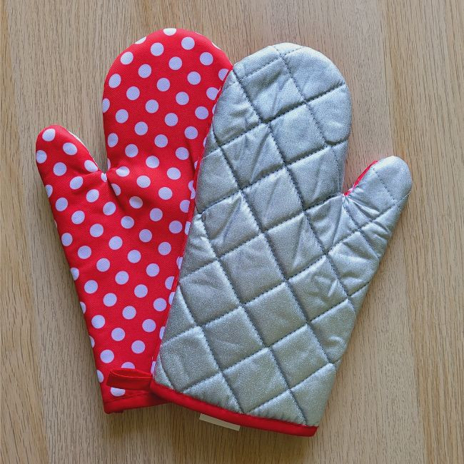 A mintás külső vidám hangulatot visz a konyhába, míg a szürke, csúszásmentes tenyérrész stabil fogást biztosít.