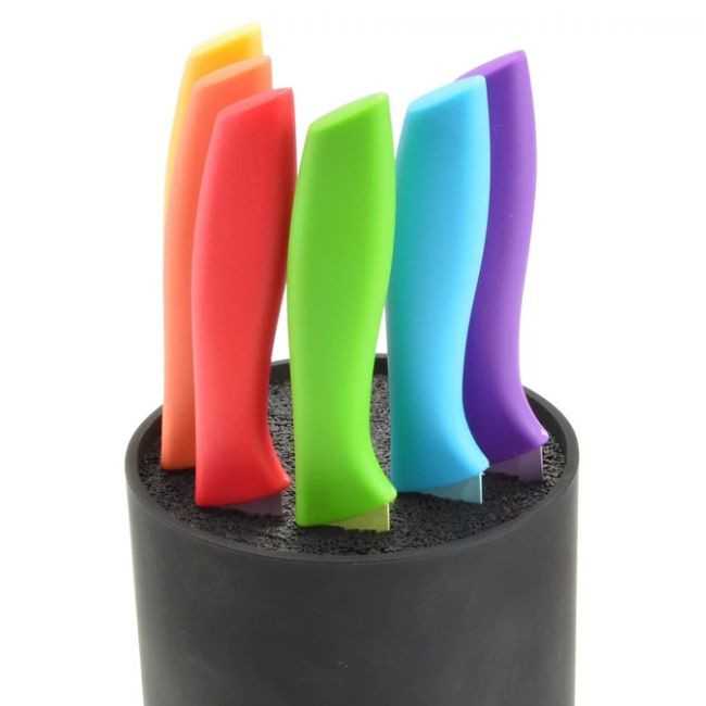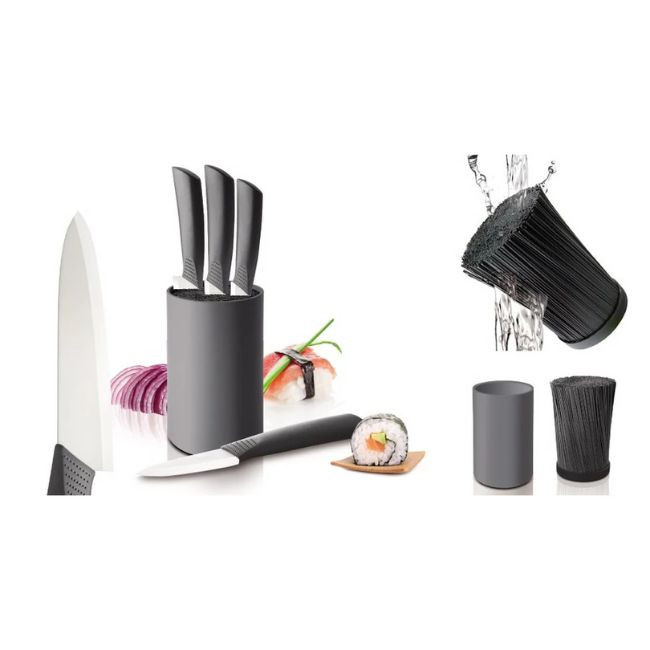 - Belsejében rugalmas sörték várják a késeidet, így szinte bármilyen méretű vagy formájú pengét könnyedén elnyel.